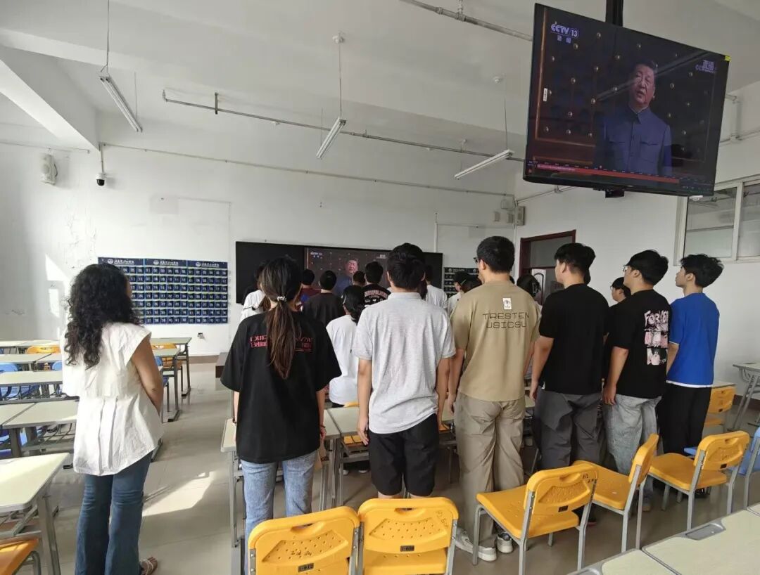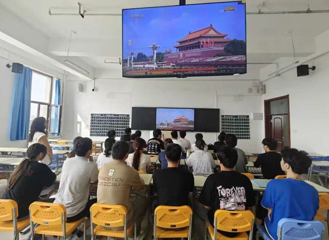 最后,辅导员曾海艳老师进行总结。她表示,今天的活动既是一次国家发展知识的普及课,更是一堂深刻的爱国主义教育课。从大家观看阅兵时专注的神情,到互动环节积极的表现,能感受到同学们对国家发展的关注、对祖国的热爱。国家的发展不是遥不可及的概念,它关乎每一个人的未来,更需要每一代人的努力。希望同学们能把今天在活动中收获的感动与力量,转化为日常学习的动力,既要学好专业知识,筑牢成长根基,也要持续关注国家发展动态、了解时代进程,始终牢记 “国家强则个人强”,以青年之担当,为祖国的美好未来贡献自己的一份力量。同时,现场不少同学在活动结束后自发打开手机,再次观看阅兵片段并合影留念,这些画面也被记录下来,成为大家铭记这份家国情怀的珍贵瞬间。