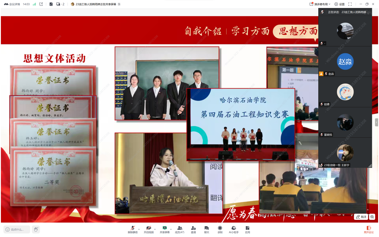 评审团依据“思想政治、法律法规、专业成绩、社会实践、创新创业、身体素质”六大维度,结合汇报内容与现场应答综合考评。经激烈角逐,最终确定“省三好学生”人选,后续将按程序公示。这场线上答辩评审,更是一堂榜样教育思政课,学子们展现的钻研韧劲与责任担当,精准契合石化专业人才培养方向;在专业领域沉潜钻研、在实践场景锤炼本领,全力成长为满足行业与社会需求的高素质应用型人才。