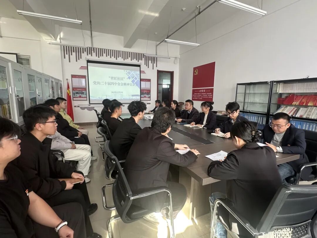 为深入学习宣传贯彻党的二十届四中全会精神,切实把社区全体师生党员的思想和行动统一到全会精神上来。2025年11月13日,青匠社区组织召开党的二十届四中全会精神专题宣讲会。社区党总支书记赵婧主持会议,社区党总支书记毛雷主讲,社区全体教师、全体党员同学参加会议。
