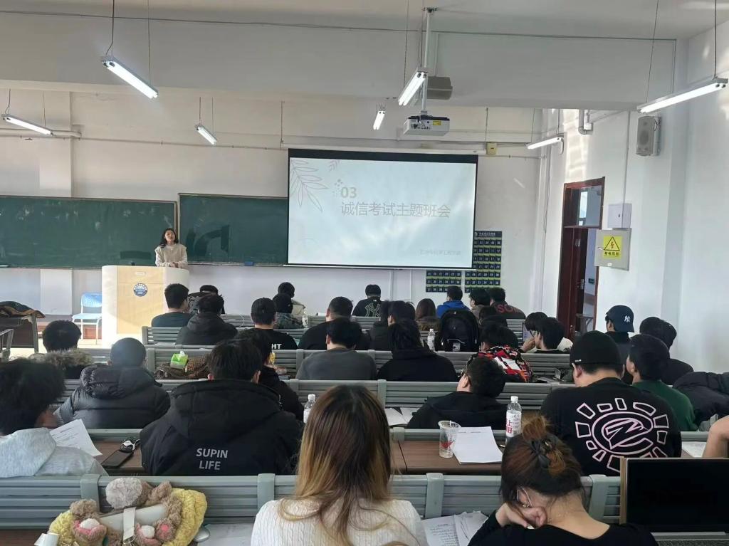 班会上,辅导员老师们首先聚焦“诚信考试”主题,进行了深入动员与教育。老师们带领同学们认真学习了学校关于考试管理的各项规章制度,重点解读了考试违规违纪的认定办法及相应后果。通过剖析典型案例,老师们强调了诚信不仅是个人品德的核心,是学术研究的基本准则,更是未来职业生涯和社会交往的基石。他们号召全体同学端正学习态度,摒弃侥幸心理,以真实的学习成果接受检验,共同营造公平、公正、清朗的考试环境,维护学术尊严与学院声誉。同学们纷纷表示,将自觉遵守考场纪律,以诚信展现石化学子的良好风貌。