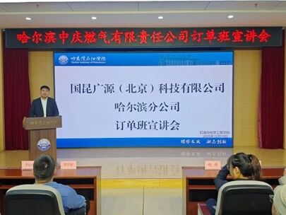 随后,国昆广源(北京)科技有限公司代表梁世超上台发言。他围绕企业发展历程、核心业务布局及行业影响力进行了详细介绍,重点阐述了国昆广源在燃气领域的技术优势、项目案例及人才储备需求。同时,他也向同学们发出诚挚邀请,欢迎大家加入订单班,与企业共同成长、共谋发展。
