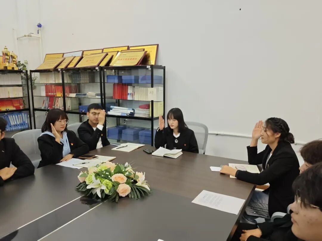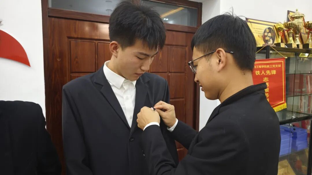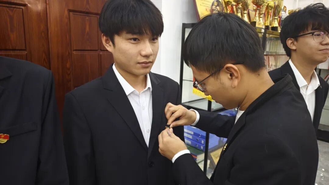 第四项议程,大会采用线上线下相结合的无记名投票方式进行表决。经各支部全体有表决权的党员投票表决,一致同意接收以上15名同学为中共预备党员。随后,各正式党员为新接收的预备党员郑重佩戴党员徽章,鲜红的党徽见证初心使命,标志着他们正式迈入党员队伍行列。