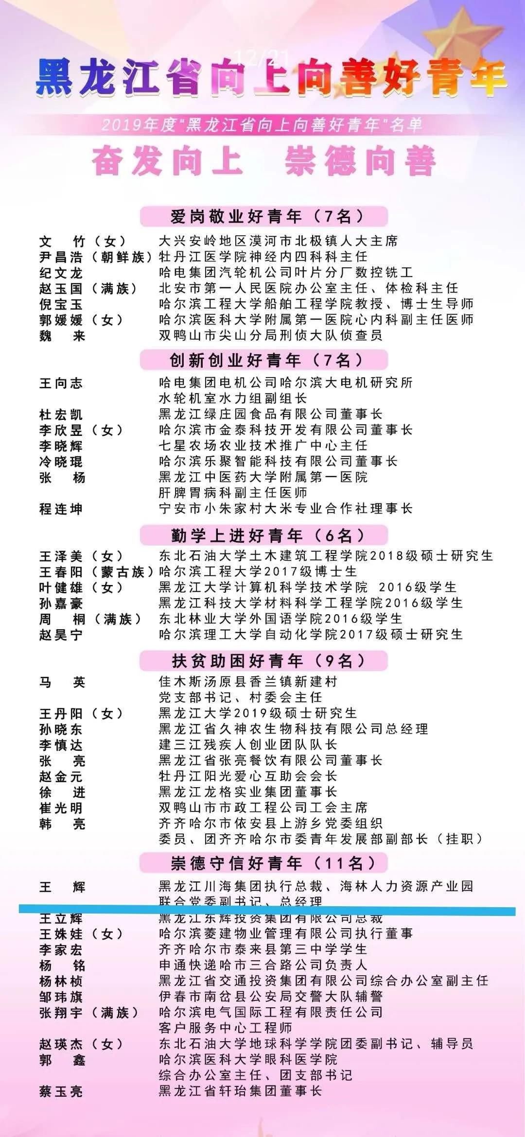 四年育苗桃李,再结硕果添香!哈尔滨石油学院2008级优秀校友川海集团执行董事王辉荣获2019年度“黑龙江省向上向善好青年”崇德守信好青年殊荣!