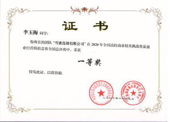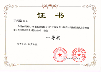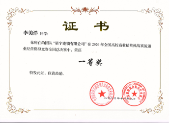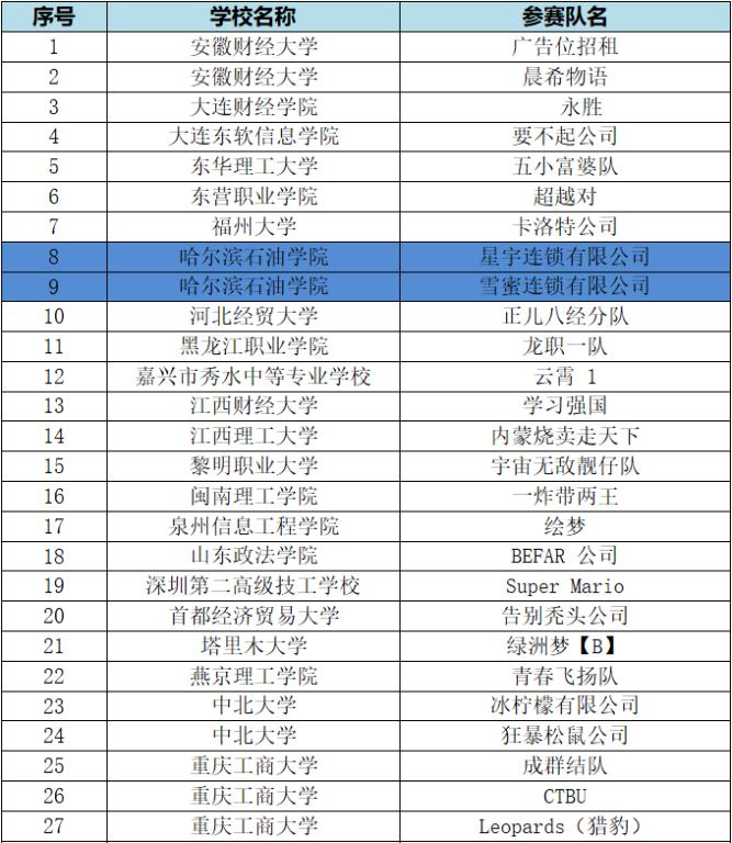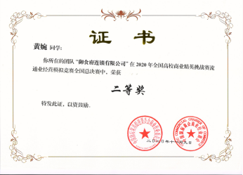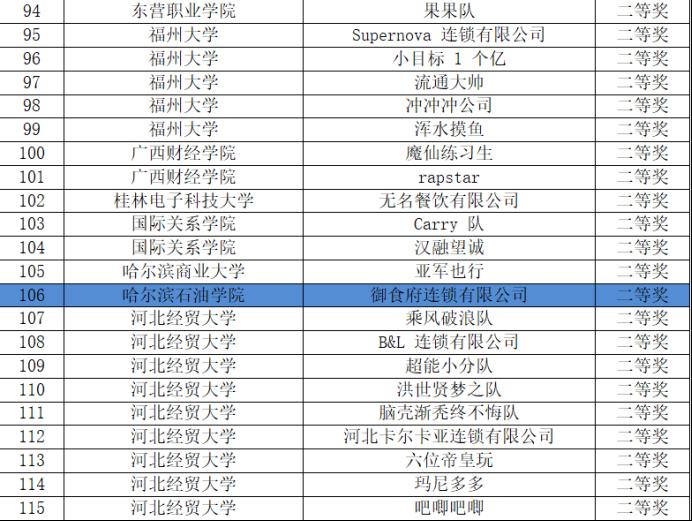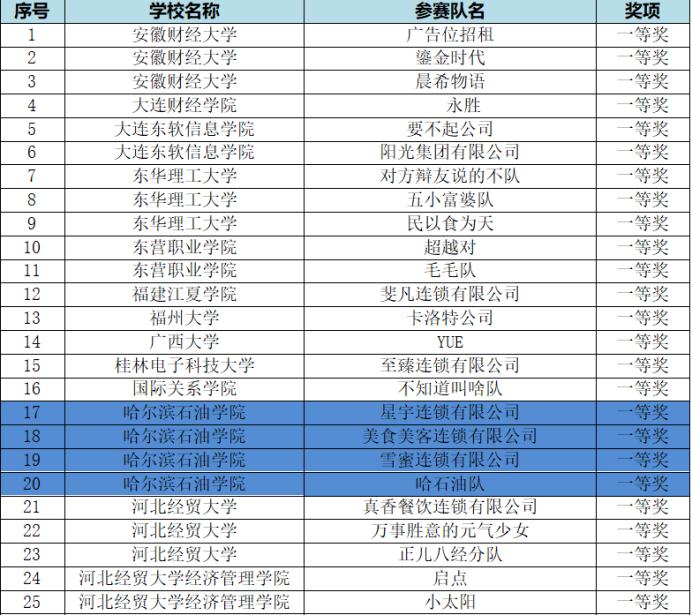 由刘洲、霍增玉、董梦迪三名同学组成的“哈石油队”代表队,及由张媛媛、屈剑飞、刘梦佳、李英超、彭益凡六名同学组成的“美食美客连锁有限公司”代表队也脱颖而出,获得了国家级一等奖的优异成绩,由阿里玛、才佳仪、丁思佳、耿启轩、黄婉、晋胜楠六名同学组成的“御食府连锁有限公司”代表队获得了国家级二等奖的优异成绩。