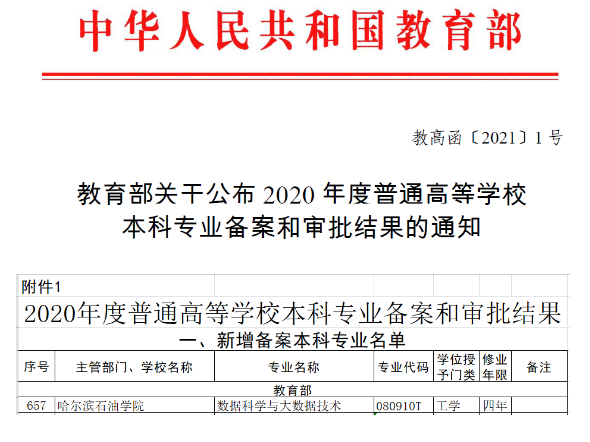 近日,教育部发布《关于公布2020 年度普通高等学校本科专业备案和审批结果的通知》(教高函[2021]1号),我校推荐申报的数据科学与大数据技术专业获教育部批准设置,计划自2021年起开始招生。