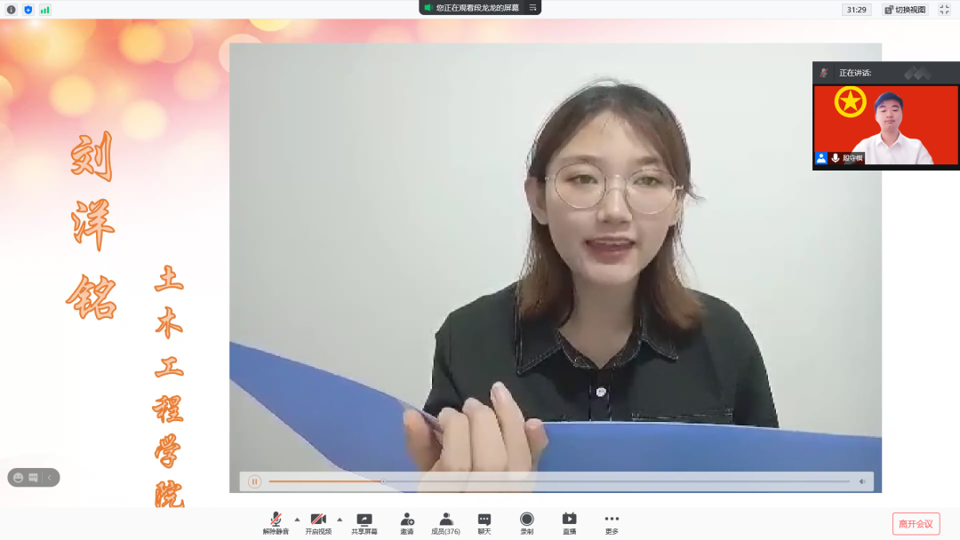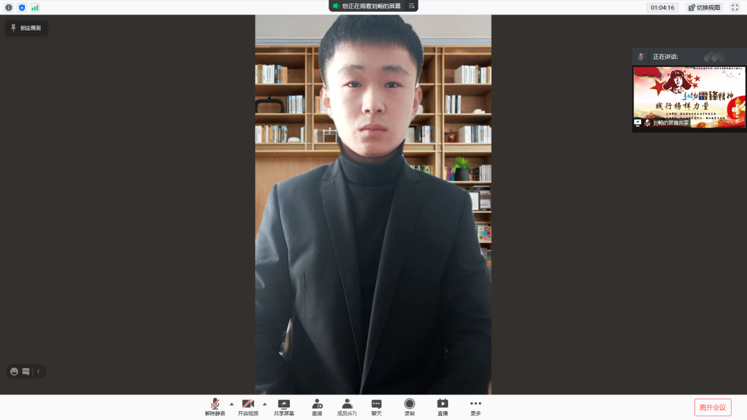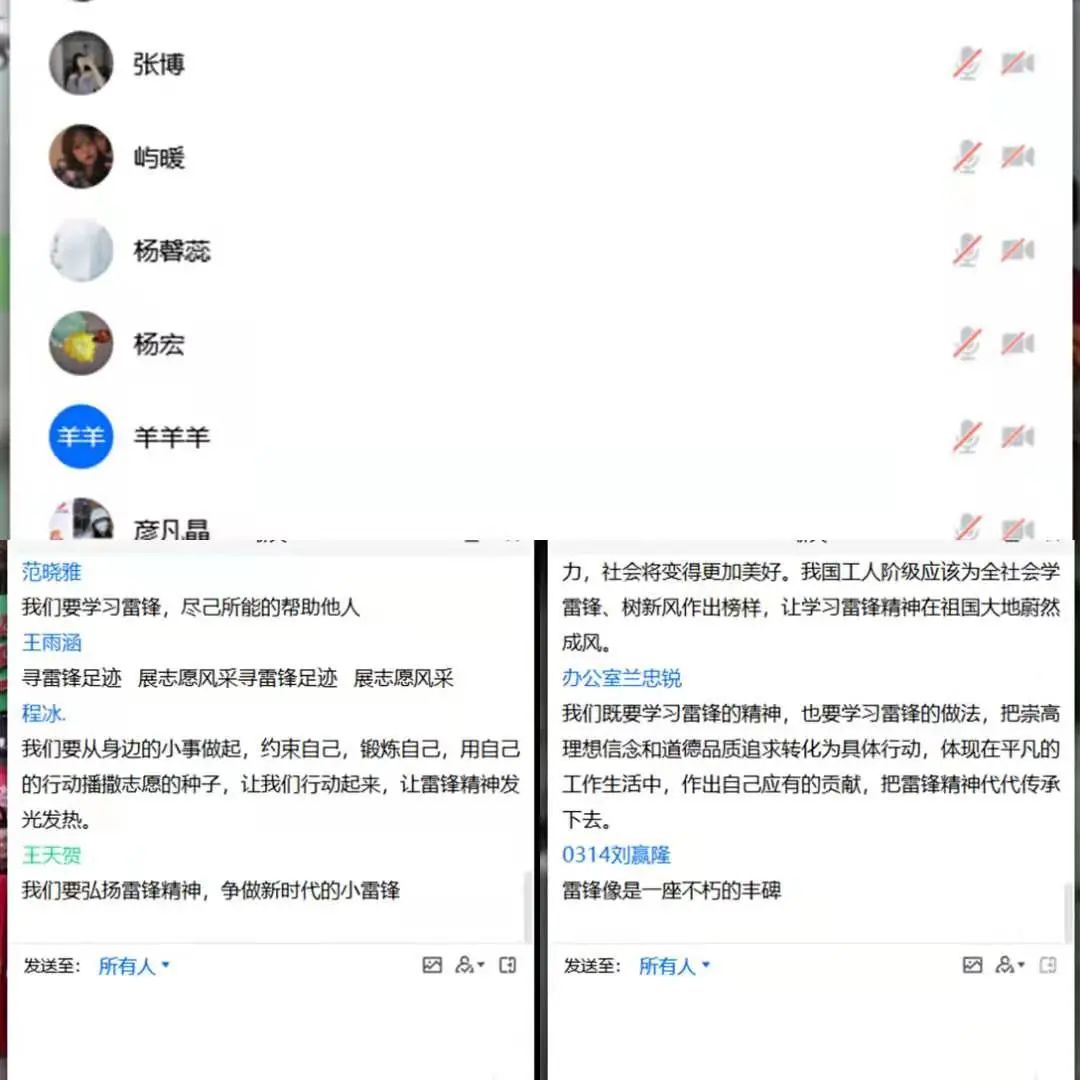 活动在土木工程学院刘洋铭同学的朗诵《雷锋》中拉开序幕,她精彩的诵读让我们深刻的了解了雷锋精神的内涵所在。随后,我校青年志愿者协会代表李龙同学向全校学生发出倡议,他倡议大家要积极践行雷锋精神,要从身边的点滴小事做起,要努力学习科学文化知识,要勤奋刻苦、努力钻研,希望通过大家的不懈努力,共同建设出美丽和谐的校园。活动中,与会全体志愿者共同重温了志愿者誓词。活动的最后,大家一起观看了影片《雷锋》,影片中,雷锋以全心全意为人民服务为行动指导,做了一件又一件为人们铭记的好事。观影过程中,同学们积极在公屏中互动,无不为雷锋同志高尚的品格所感染。