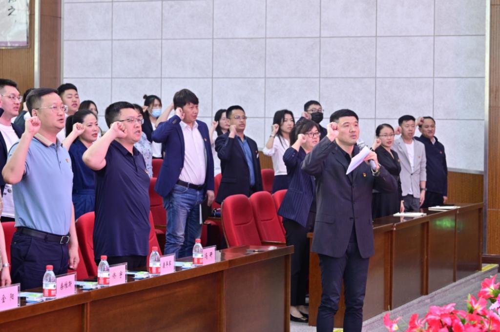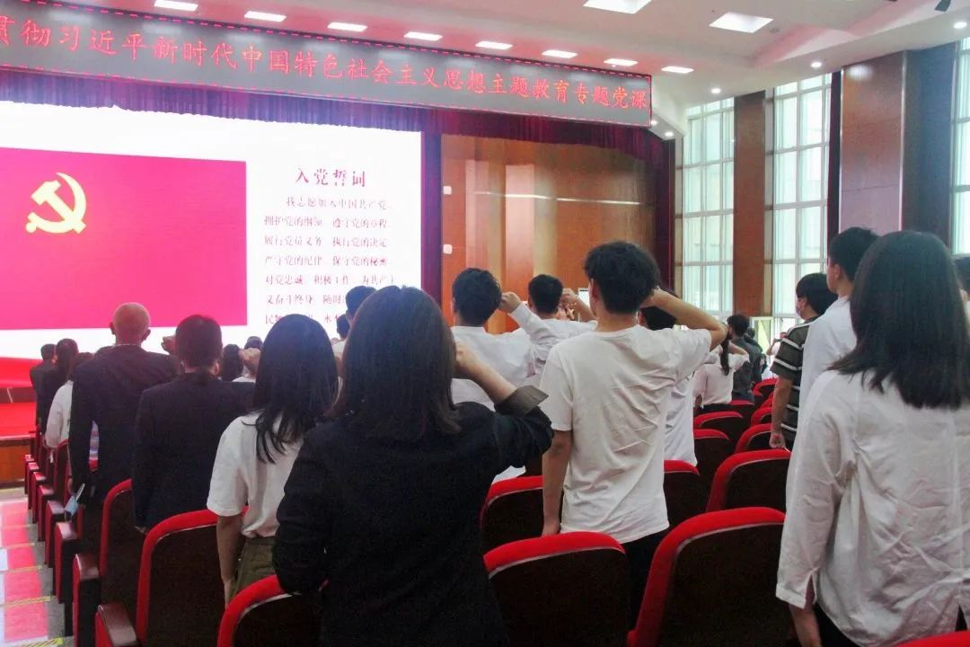 党课后,全体党员面向党旗宣誓,重温入党誓词,党委副书记、副校长冯研领誓。党员们声音铿锵有力,表达出不忘初心、砥砺奋进的信念及决心。