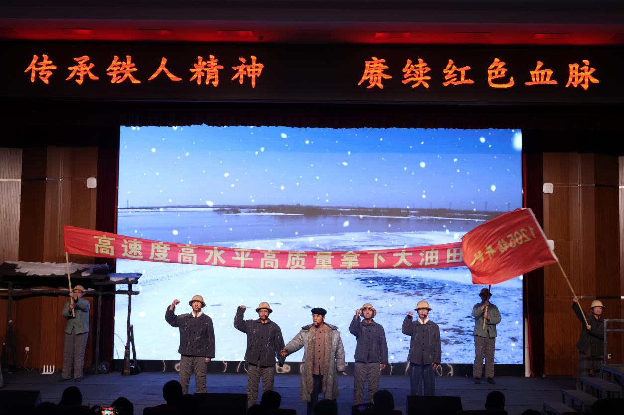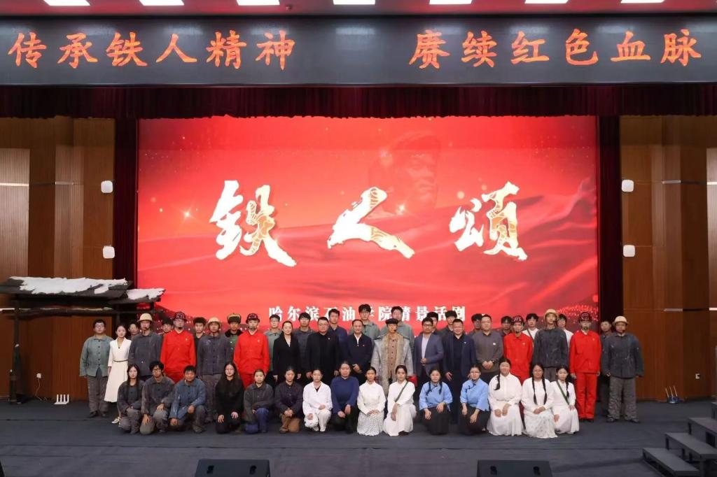思政课实践教学有方法,情景剧演得有温度、有力度、有效度。当天下午,我校原创情景话剧《铁人颂》2025年校内第三场演出在图书馆报告厅精彩上演。该剧以新中国石油战线的时代楷模王进喜为原型,以五幕剧的艺术形式,生动再现了那段艰苦卓绝、为国奉献的奋斗历程。全剧以崇高的精神追求和精湛的舞台表现,深刻诠释了铁人精神的时代内涵与永恒价值,艺术化展现了“宁肯少活二十年,拼命也要拿下大油田”的豪迈气概和崇高境界,实现了思想性、艺术性与教育性的有机统一。