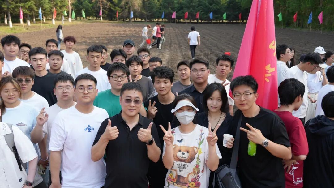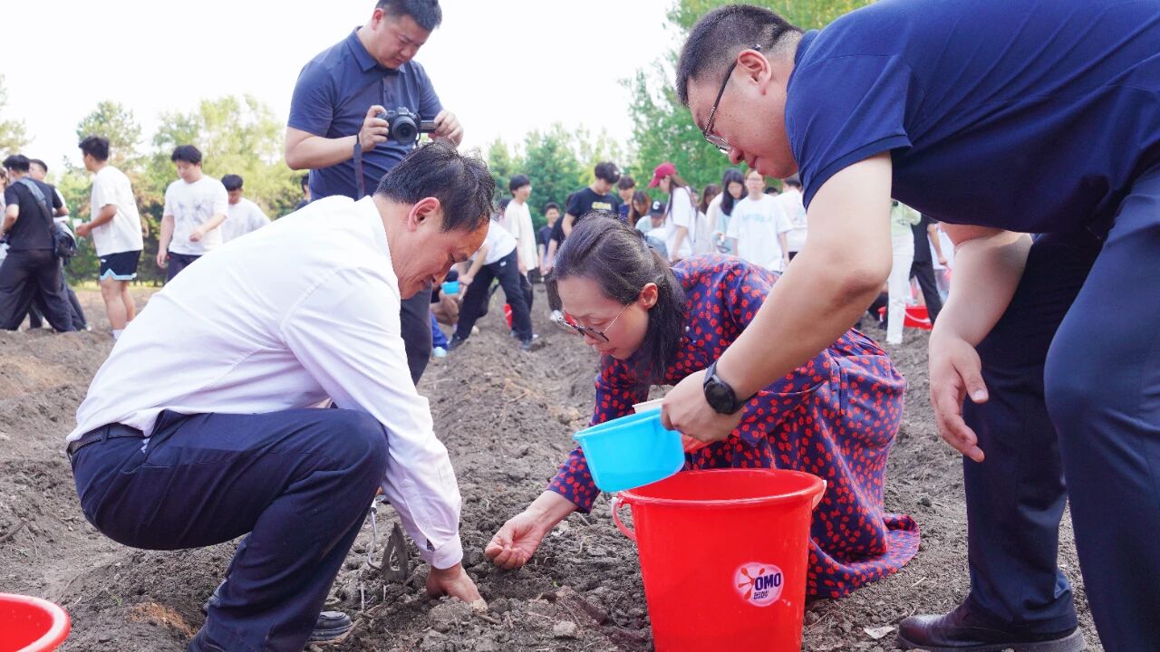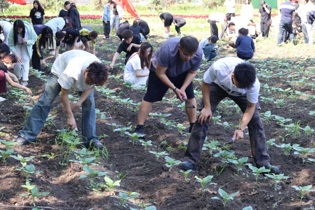 揭牌仪式后,千余名学生分批次投身土地开垦。在后勤处园林师傅的指导下,学生们挥起铁锹、耙子,亲身参与土地开垦、翻地施肥、播种覆土等全流程作业。