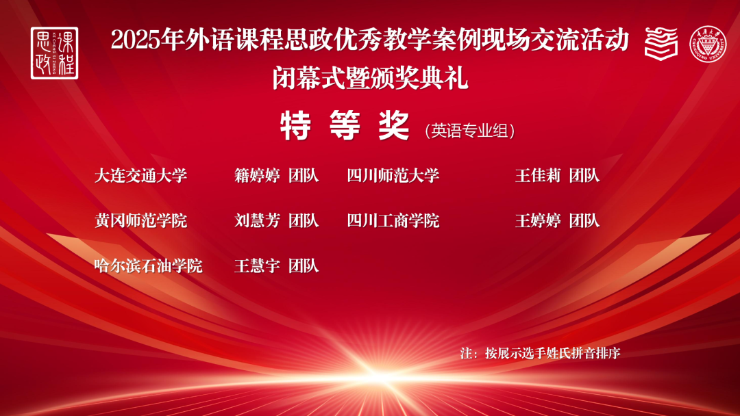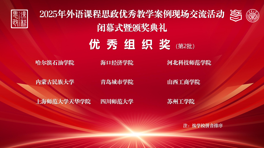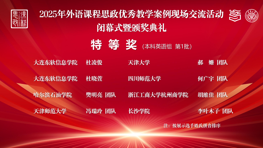 近日,2025年外语课程思政优秀教学案例现场交流活动在重庆落下帷幕。哈尔滨石油学院派出的两支教师团队(本科英语组和英语专业组)双双荣获全国特等奖,哈尔滨石油学院获优秀组织奖,创下我校在这一国家级赛事中的历史最佳成绩!