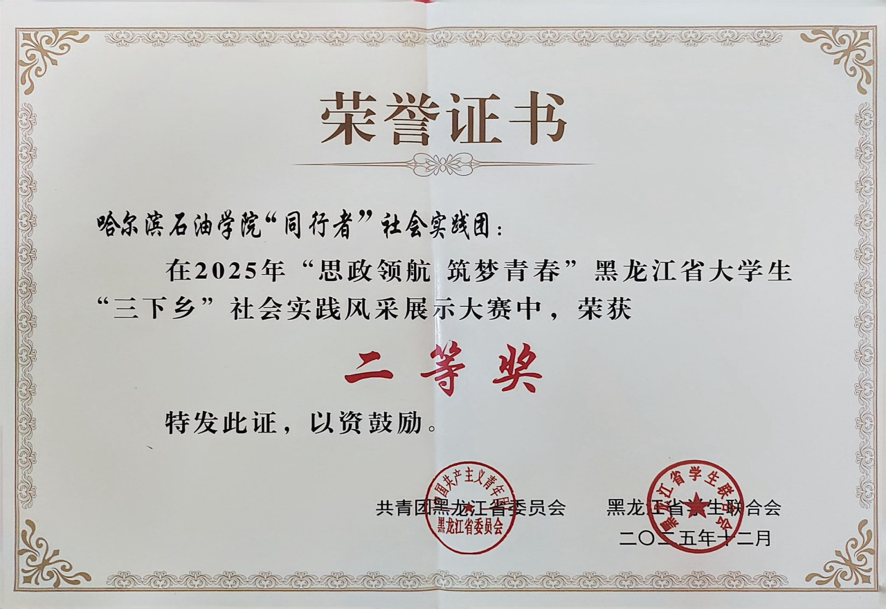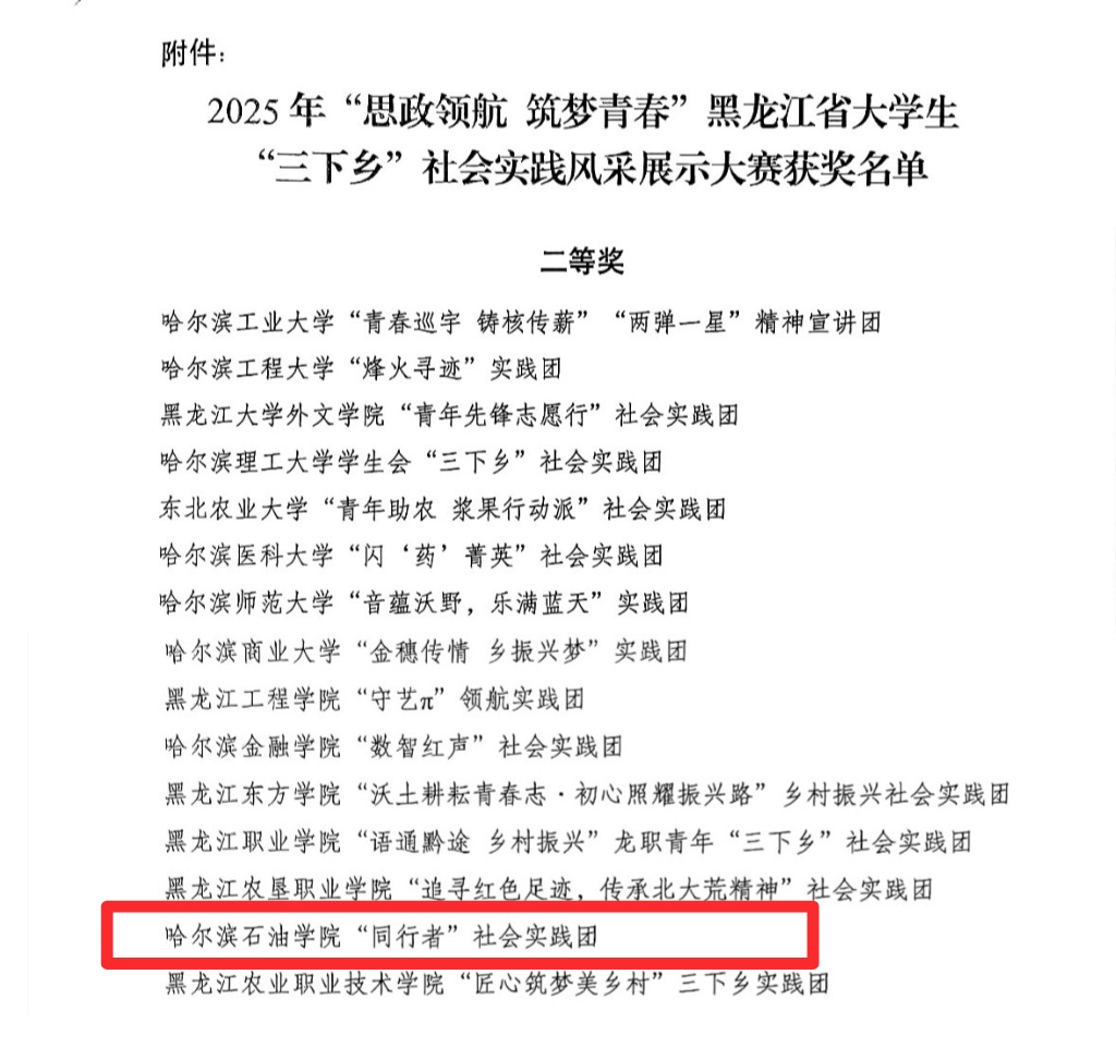 12月4日下午,2025年“思政领航 筑梦青春”黑龙江省大学生“三下乡”社会实践风采展示活动在黑龙江大学举行。经校赛推荐、专家评审、现场答辩等环节综合评定,我校“同行者”社会实践团从全省69所高校、8000余支实践团队中脱颖而出,荣获大赛二等奖。