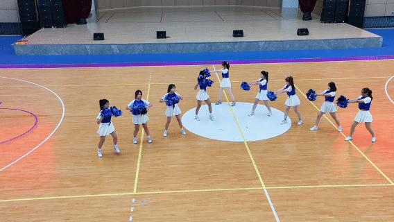 来看本届比赛评委团——主裁判为黑龙江省啦啦操委员会赛事中心主任、黑龙江省健美操协会副秘书长、啦啦操国家级裁判员刘楠,还有校团委书记陈志勇,体育教研部主任谭波、副主任李静宇、教师吕金莹组成的评审团,用专业眼光为每支队伍打分。