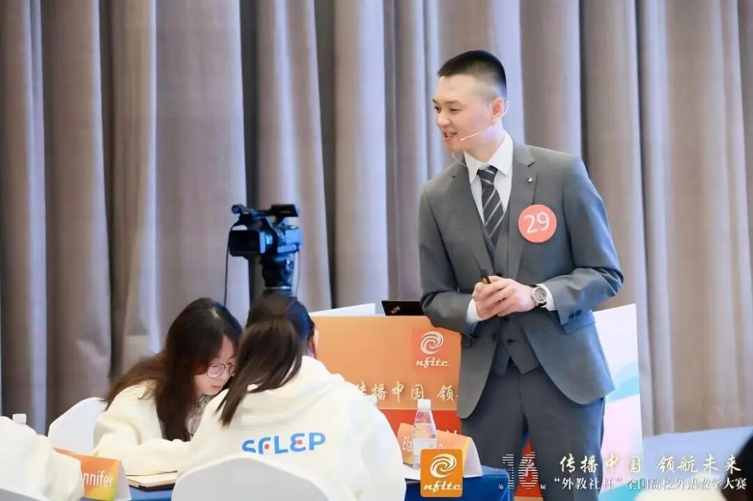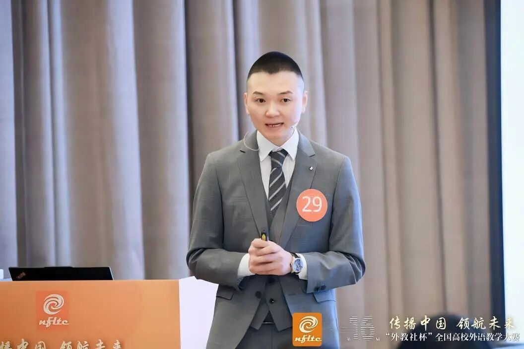 本届大赛包含决赛和全国总决赛两个环节的比赛。全国决赛中,樊明亮教师凭借扎实的学术功底、深厚的知识积淀开阔的国际视野、精湛的教学技艺与娴熟的现代教育技术应用能力,呈现了一堂堂兼具创新性与实效性的精彩示范课,充分彰显了新时代高校外语教师的专业素养与育人担当。经专家评委团严格评审,樊明亮老师以全场90.19的总分成功晋级全国总决赛。决赛环节中,综合课组和视听说课组选手围绕指定授课文本,在20分钟的授课展示环节中运用创新性教学设计、教学方法,以数智化手段赋能课堂,将语言教学与育人目标充分结合,展现了扎实的专业功底。樊明亮老师凭借出色的设计理念与清晰的授课思路得到了评委和观众的一致好评。