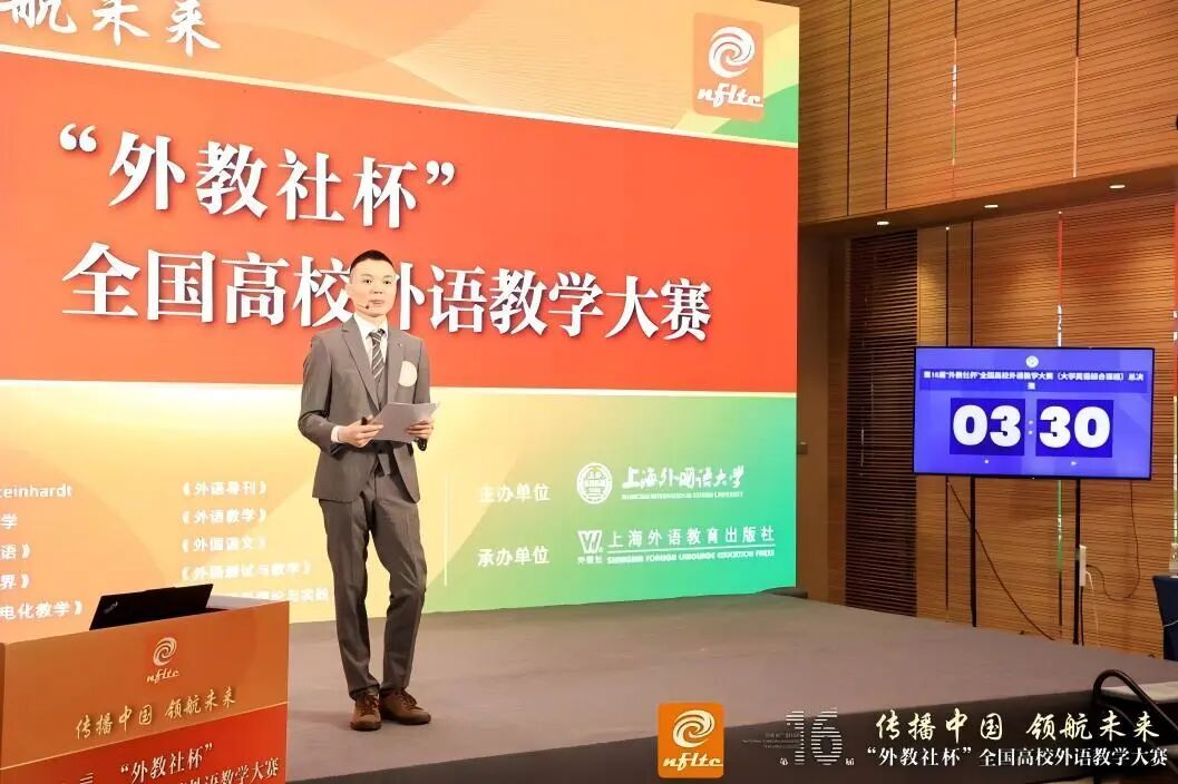 外教社杯全国高校外语教学大赛始创于2010年,是我国最早举办的全国性外语类教学大赛。大赛连续多年被纳入中国高等教育学会发布的“全国普通高校教师教学发展指数”,在提升高校的教学能力、教学水平和教学质量方面发挥了重要作用。本次大赛大赛由上海外国语大学主办,上海外语教育出版社承办,以“传播中国 领航未来”为主题,今年共有来自全国30个省、自治区、直辖市的58位优秀高校外语教师参与到最后的决赛舞台。我校樊明亮老师以总分第5名的成绩荣获大赛综合组二等奖!