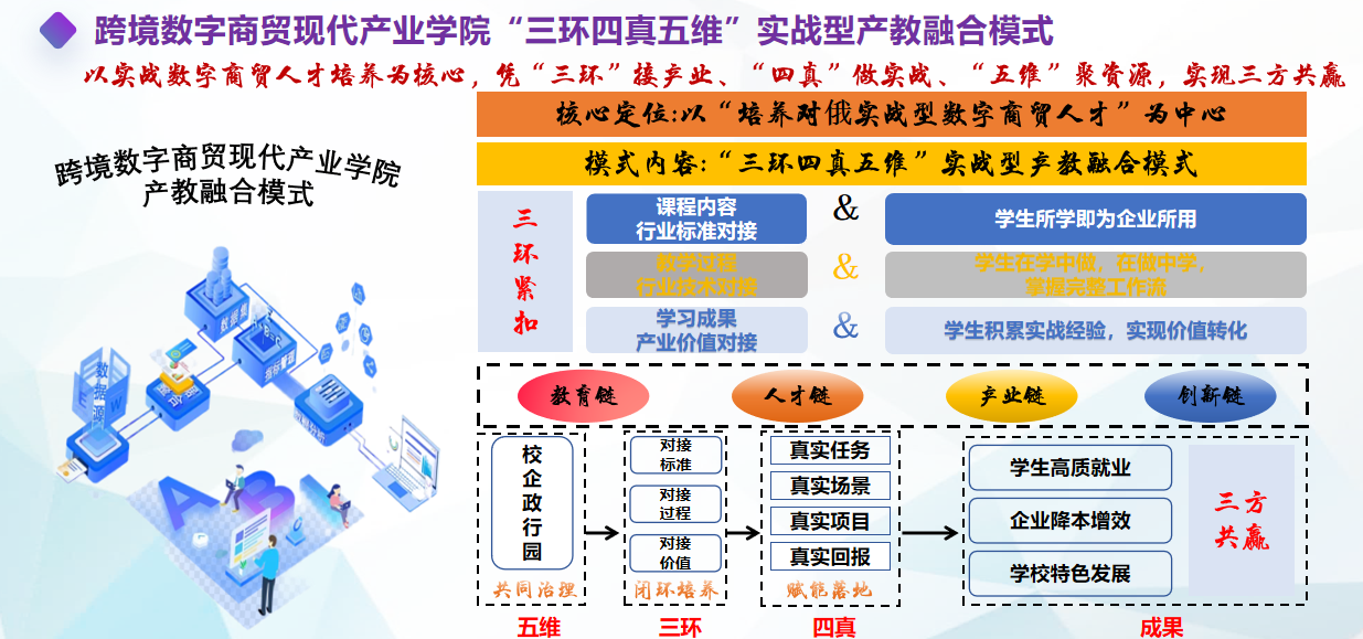 学院与黑龙江俄速通集智开展深度合作,具体包括共建实训基地、共设课程体系、共组教学团队。这一模式将真实的跨境电子商务运营场景与教学过程相融合,培养学生具备数字商贸运营、跨境供应链管理、数据分析与国际化商务沟通等复合型能力。