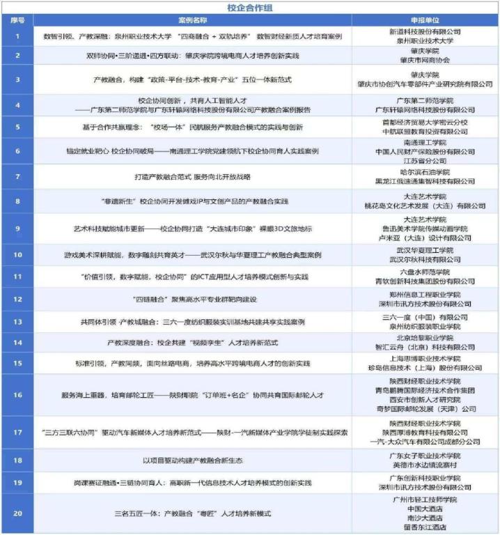 该案例从全国众多申报项目中脱颖而出,表明其在创新性和可推广性方面获得了评审专家的高度认可。作为仅有的20个“校企合作组”典型案例之一,它为其他高校开展产教融合提供了可资借鉴的实践范式。