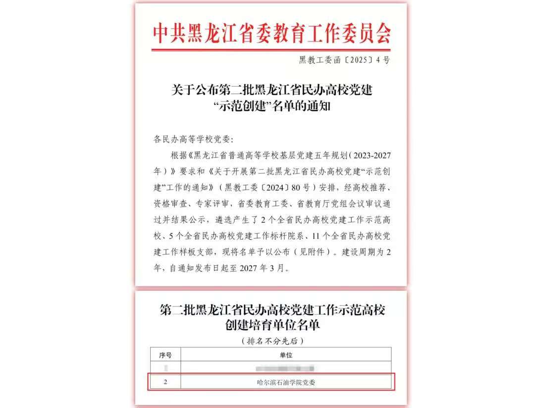 这一年,哈尔滨石油学院党委入选“党建工作示范高校”创建培育单位。这份荣誉是对学校党建工作的肯定,更是将“为国育才”的使命刻进校园血脉的生动注脚。