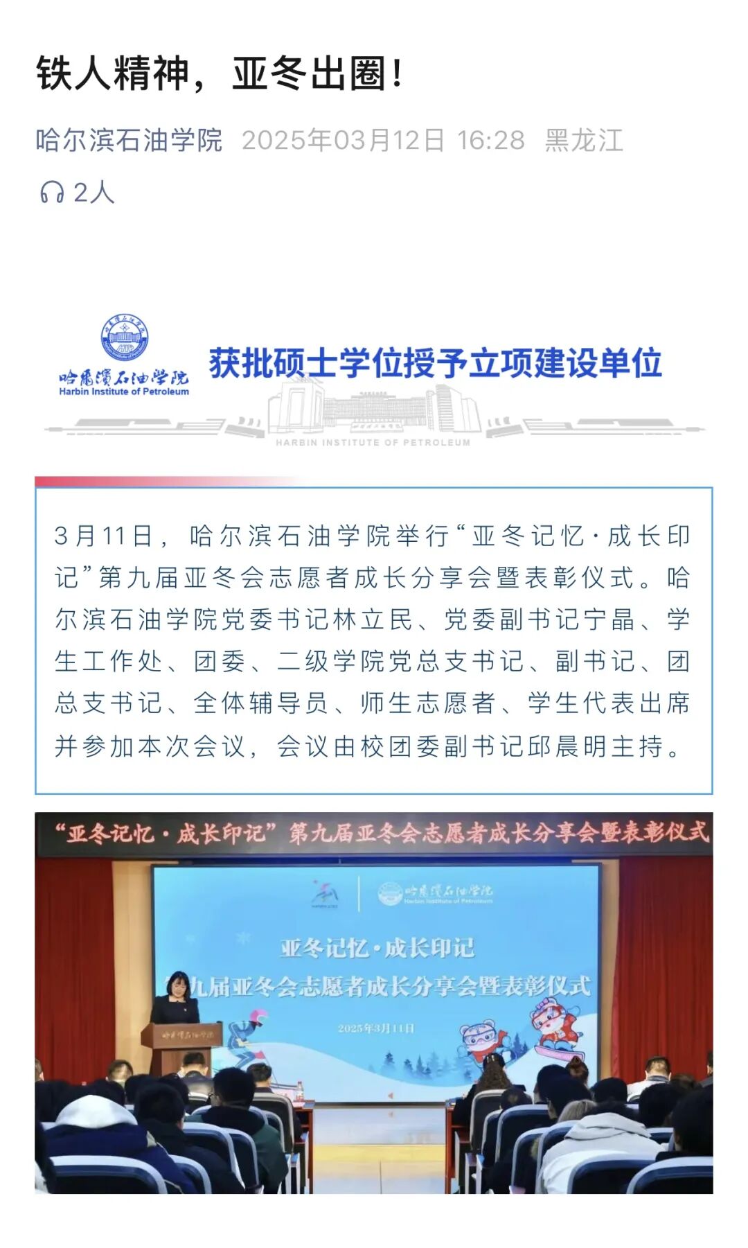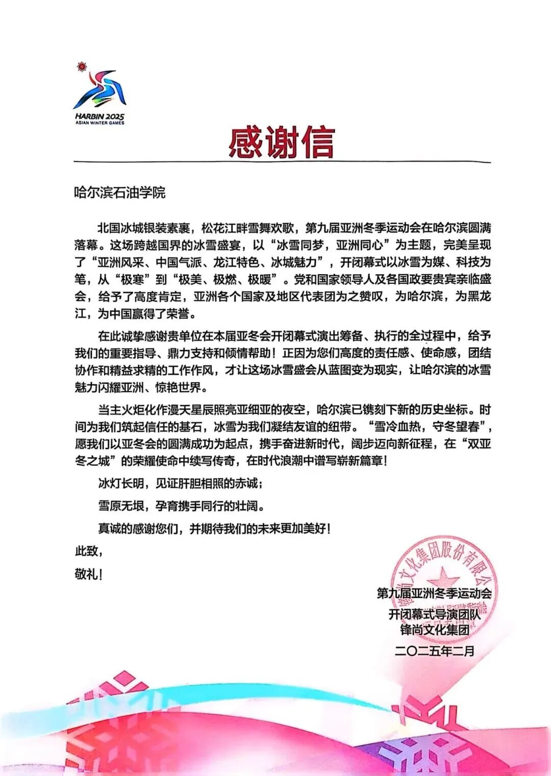 2月7日,在第九届亚冬会成功举办一周年之际,哈尔滨市隆重举行总结表彰大会。省委常委、市委书记于洪涛讲话,市委副书记、市长王合生主持,市政协主席孙珅出席,市委副书记、政法委书记马志勇宣读表彰决定。与会领导为受表彰的先进集体和先进个人代表颁奖。我校获“先进集体”荣誉,接受来自整座城市的崇高敬意与嘉奖。