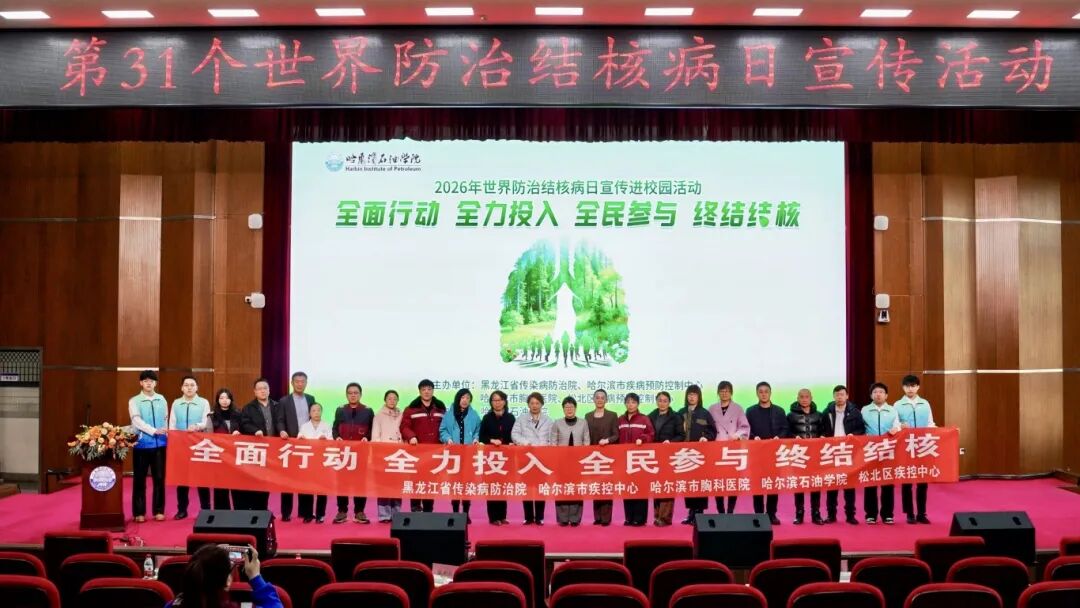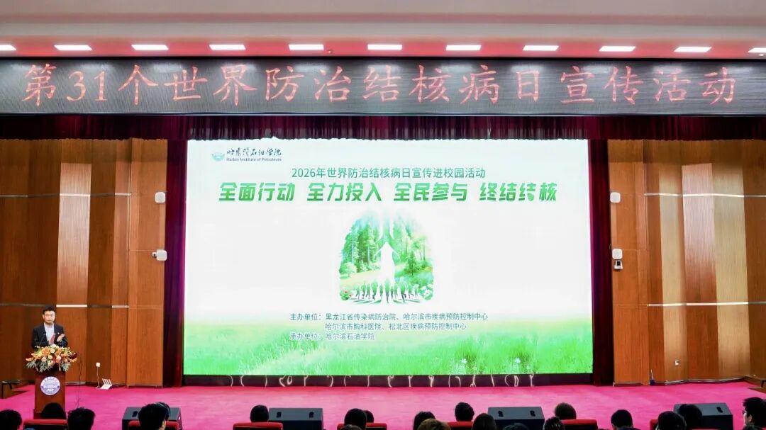 3月20日上午,由黑龙江省传染病防治院、哈尔滨市疾病预防控制中心、哈尔滨市胸科医院、松北区疾病预防控制中心主办,哈尔滨石油学院承办围绕“全面行动、全力投入、全民参与、终结结核”主题的2026年世界防治结核病日宣传进校园活动在学校图书馆报告厅举行。
