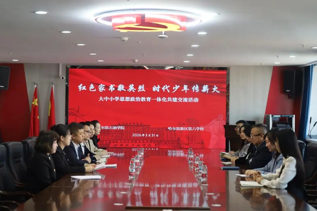 红色浸润,薪火相传。为深入推进大中小学思想政治教育一体化建设,传承红色基因、厚植家国情怀,2026年3月31日,哈尔滨新区第六学校党支部副书记李博、大队辅导员何晓慧带领少先队员代表来到我校,联合开展“红色家书敬英烈 时代少年传薪火”大中小学思想政治教育一体化共建交流活动,并举行“红色文化实践教育基地、少先队活动基地”授牌仪式,马克思主义学院院长吴卫东、党总支书记、副院长王瑞出席活动、马克思主义学院全体教师、大学生代表参加本次活动。