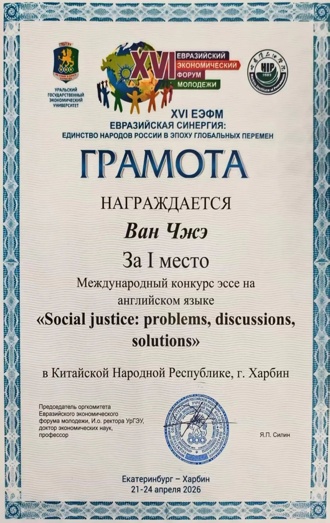 在竞争激烈的欧亚青年经济论坛英语征文国际大赛中,我校2023级新能源科学与工程专业王喆同学从参赛青年中脱颖而出,一举斩获大赛一等奖,获得丰厚奖金,同时获邀亲赴俄罗斯领奖。这是学校国际化人才培养模式与教学质量的有力印证,展现了哈油学子具备参与全球竞争的综合素养。