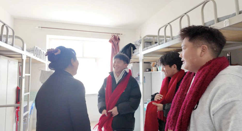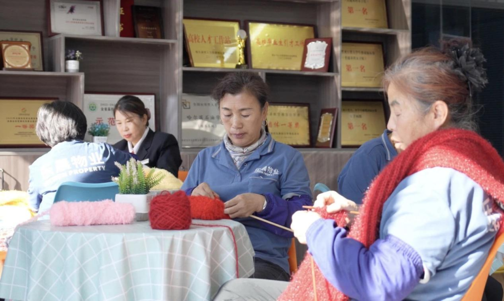 物业部经理周曼霞介绍,今年教师节,后勤物业团队荣获学校先进集体奖。她想到学校很多南方孩子第一次在东北过冬,很难适应这里的温度,也不会准备那么多的保暖用品,她就想到用这1000块钱奖金,买一些毛线,为孩子们织围巾。她的想法得到了宿管阿姨们的全力支持,22名宿管阿姨、60多名保洁阿姨第一时间加入“织围巾”队伍中,利用十一假期、午休和晚间休息时间,连续赶工1个月,织出了100条属于哈油学生专属的“爱心围巾”。