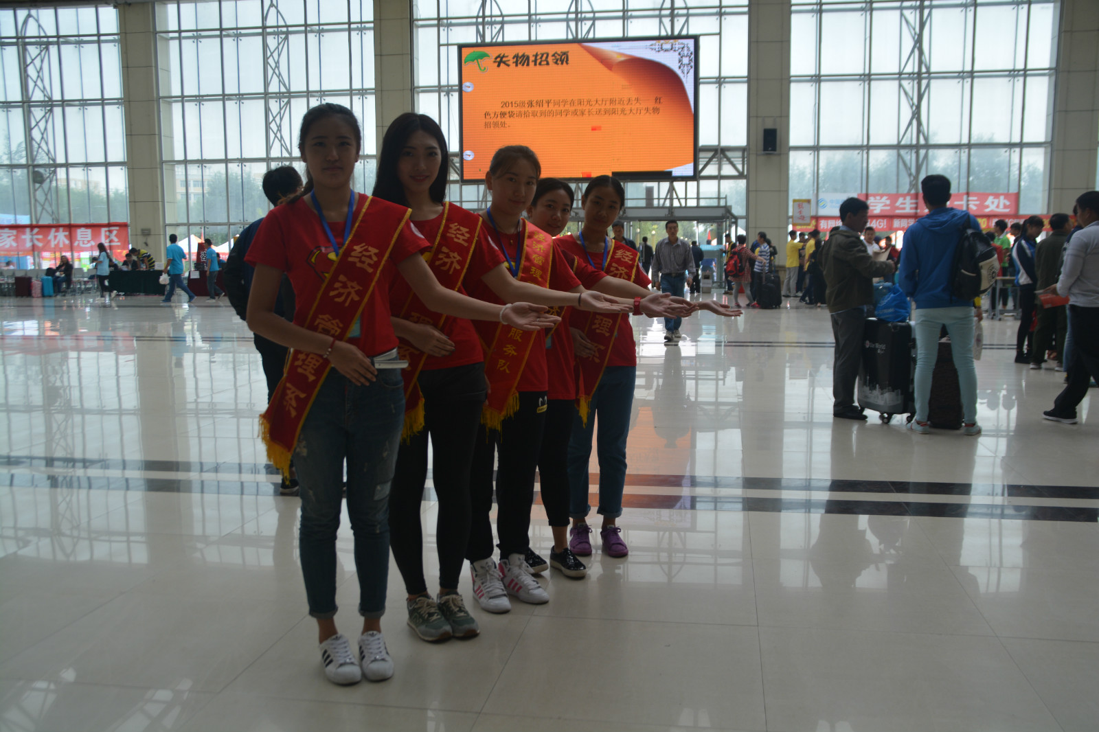 下车伊始,新生和家长就被前来迎接的经管学子的热情所包围,一张张灿烂的面容,都向前来报到的学生和家长展示经管学子的热情与朝气。