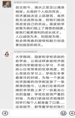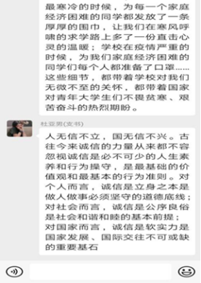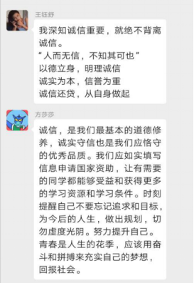 各班级利用微信平台,开展学生之间的交流会,讨论学生正确诚实的申请国家助学贷款时和助学金的话题和感悟。此次交流会增强了学生的诚信意识和责任意识,提高了学生的征信意识、金融意识、风险意识和法律意识,帮助学生树立了正确的消费观、价值观和理财观念。