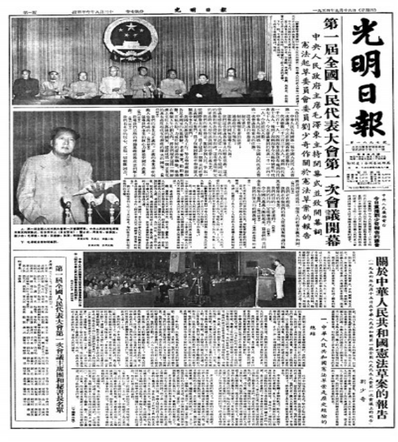 9月15日-28日 一届全国人大一次会议举行。会议通过《中华人民共和国宪法》;选举毛泽东为国家主席,刘少奇为全国人大常委会委员长;决定周恩来为国务院总理;决定设立国防委员会,毛泽东兼任国防委员会主席。全国人民代表大会的召开,标志着人民代表大会制度在全国范围内建立起来。