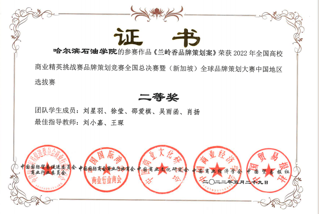 2022年全国高校商业精英挑战赛竞赛品牌策划全国总国赛二等奖1项、三等奖1项。