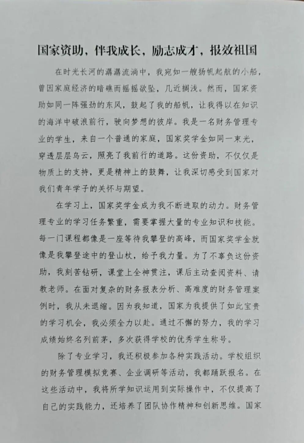 “国家资助,伴我成长,励志成才,报效祖国” 征文活动不仅为同学们提供了一个展示自我、抒发情感的平台,更是经济管理学院落实立德树人根本任务、加强学生思想政治教育的生动实践。经济管理学院未来将继续开展形式多样、内涵丰富的主题教育活动,引导青年学子将个人理想融入国家发展大局,激励他们以更加饱满的热情、更加昂扬的斗志,在实现中华民族伟大复兴的征程中贡献青春力量。