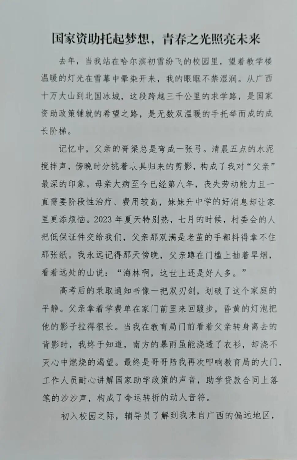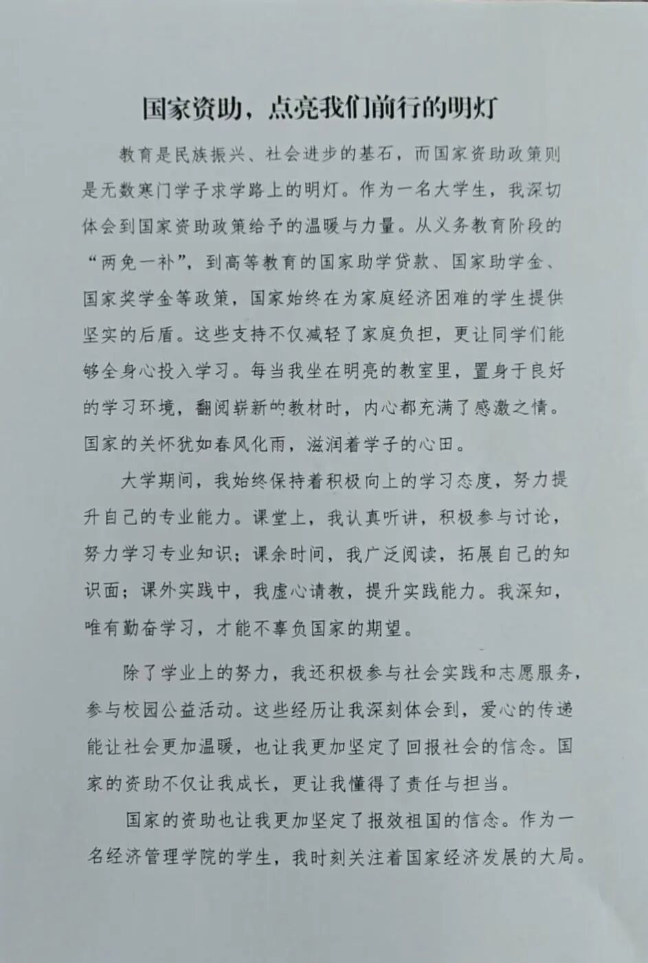 为落实立德树人根本任务,充分发挥资助育人功效,根据学工处工作通知(2025-13)《关于开展哈尔滨石油学院2025年资助育人主题活动的通知》要求,经济管理学院成功秉持“扶困”“扶智”“扶志”并重原则,举办了“国家资助,伴我成长,励志成才,报效祖国”主题征文活动。全院同学积极响应,踊跃参与,用文字书写青春理想,以笔墨传递报国信念。