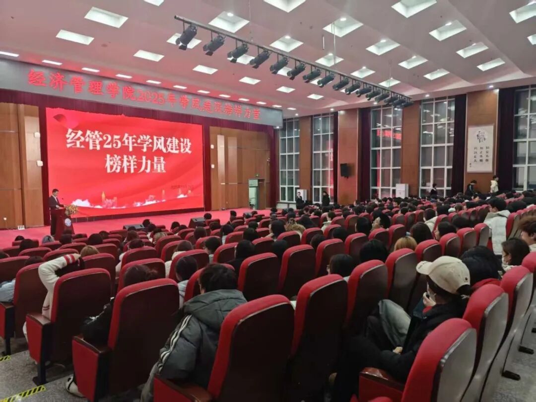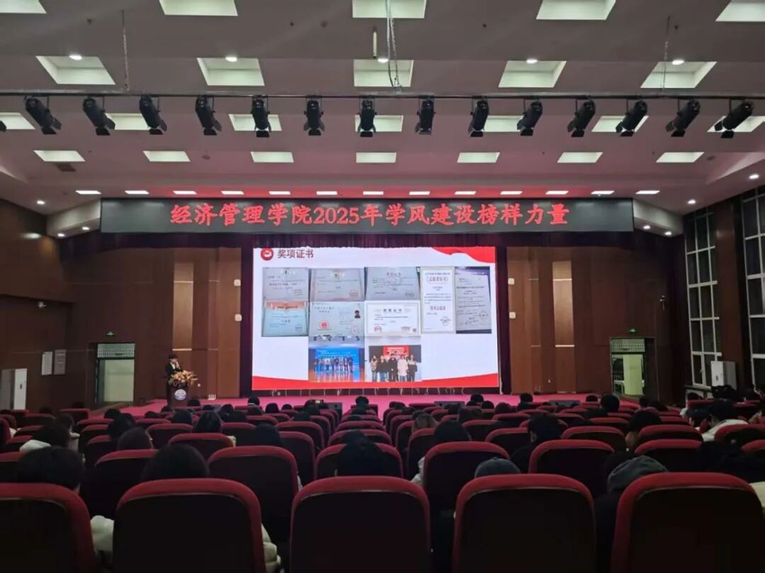 为深化学风建设,营造勤奋向上、严谨治学的校园文化氛围,2025年11月19日,经济管理学院“学风建设·楷模力量”主题交流会在图书馆报告厅盛大启幕。活动创新采用“线上视频+现场讲述”的形式,邀请五位不同年级的杰出学子分享成长历程,为在场师生呈现了一场兼具干货与感染力的精神盛宴。报告厅内人声鼎沸,主持人以“学风,为大学精神之基,为成长之沃土;楷模,为青春之引,为征途之灯塔”的开场白,深刻阐释活动意义,正式拉开交流会序幕。
