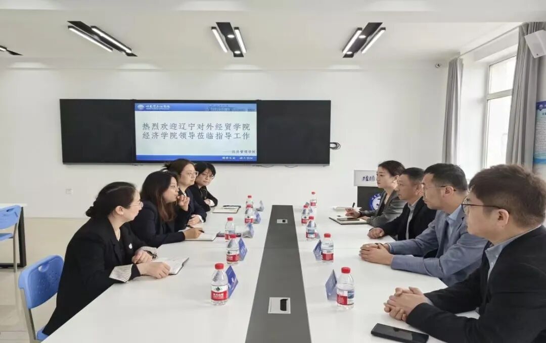 为深化专业建设,推动教育资源共享与创新发展,5 月 14 日,辽宁对外经贸学院作为边疆跨境电商虚拟教研室成员单位,莅临经济管理学院开展专业交流活动。双方围绕产业学院建设经验及未来发展,展开深入探讨。哈尔滨石油学院经济管理学院院长任洪云、副院长郑彩飞、国际经济与贸易专业主任季克华、跨境电子商务专业主任崔文颖及辽宁对外经贸学院经济学院院长刘钊、副院长杨亮出席本次交流会。