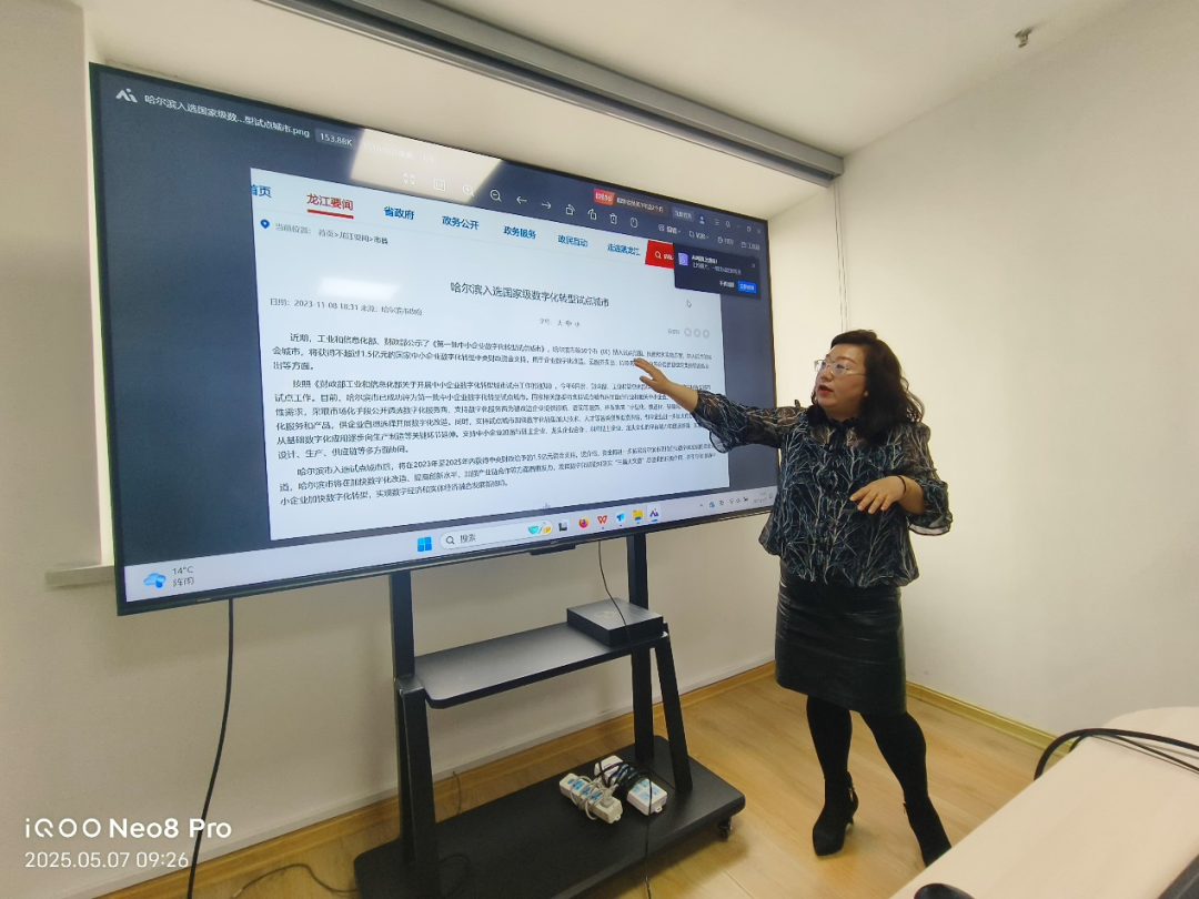 在政策讲解环节,马经理结合《黑龙江省“十四五”数字经济发展规划》对工业和信息化部关于征求《中小企业数字化水平评测指标(2024年版)》意见的函进行解读,系统阐释了数字化转型与龙江实践之间的重要关系。同时,针对高校关注的产教融合领域,马经理特别强调,将深化校企协同创新,支持高校与企业联合培养人才。