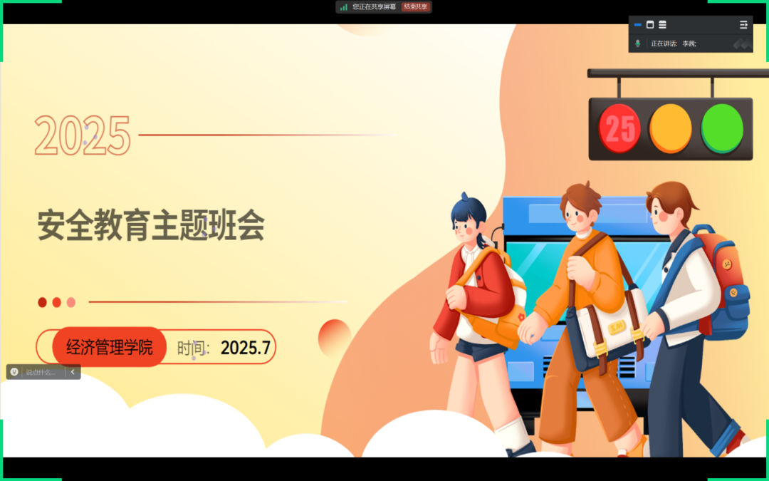此次线上主题班会,经济管理学院全面覆盖学生暑期生活场景,把安全意识传递到每一位学生。未来,学院会持续完善信息沟通与应急响应机制,辅导员也将保持和学生的动态联系,全力守护学生暑期安全,筑牢校园安全防护网。