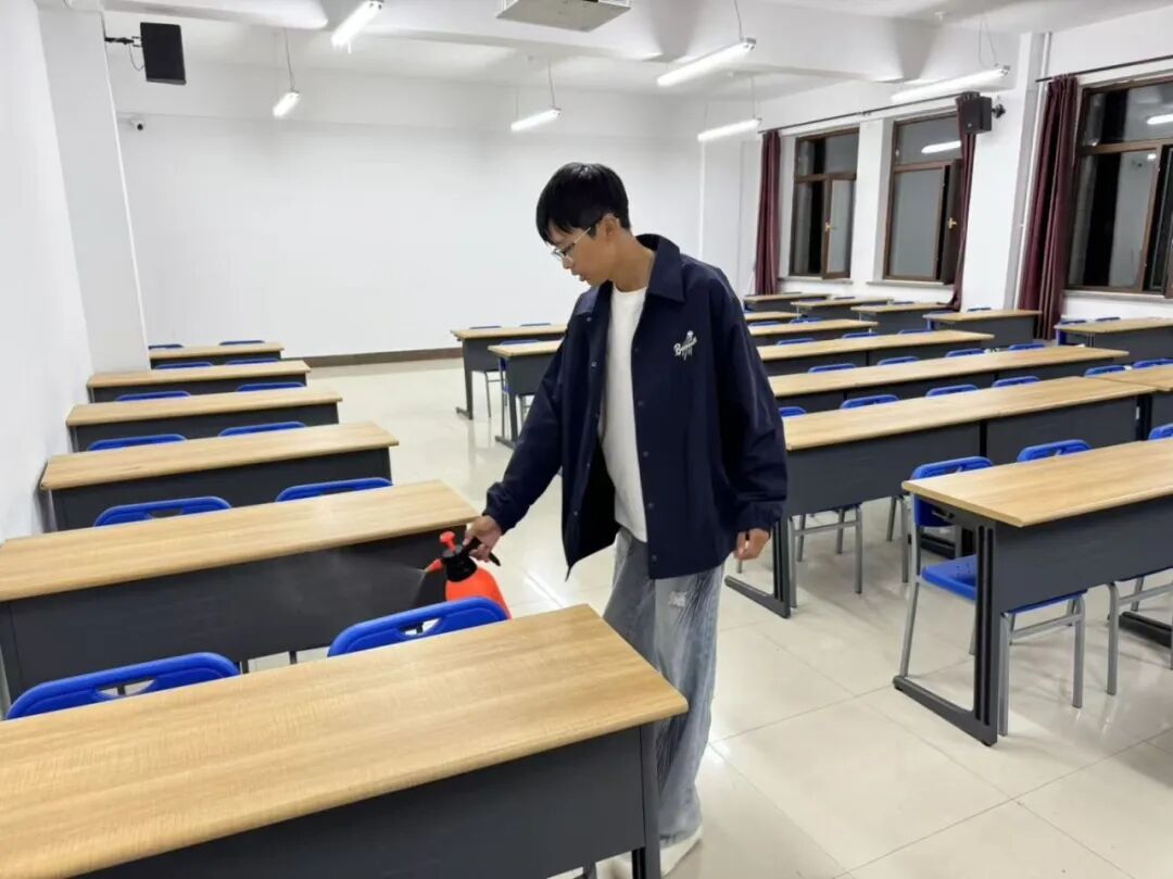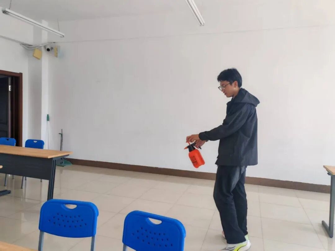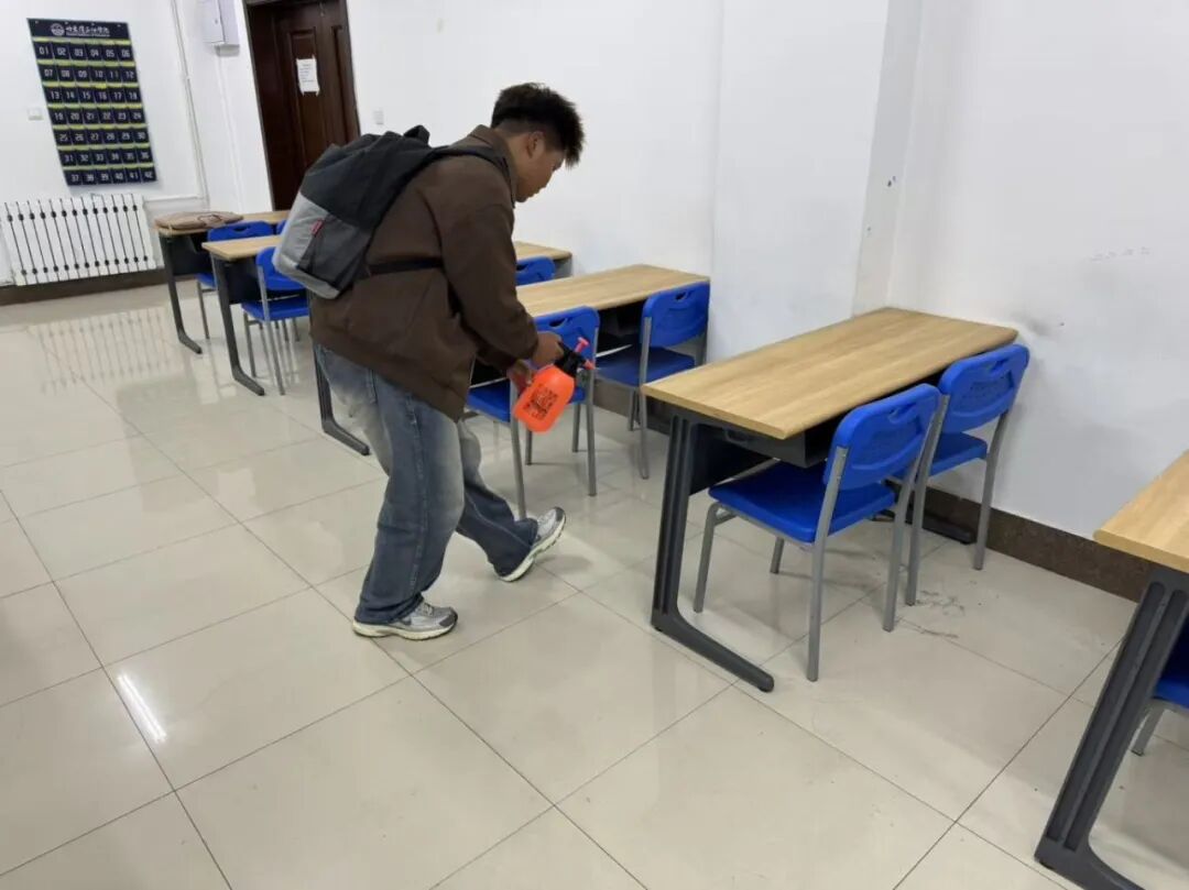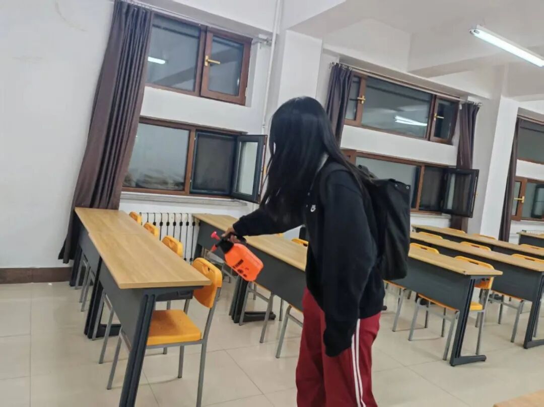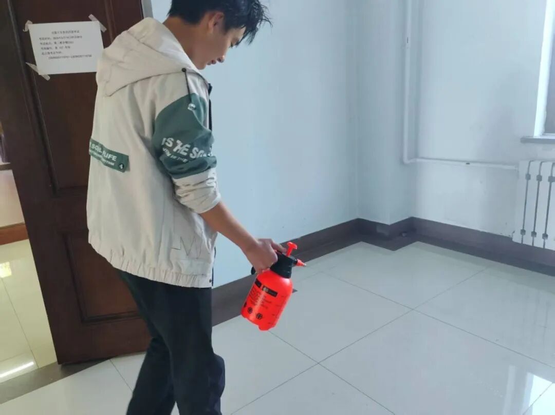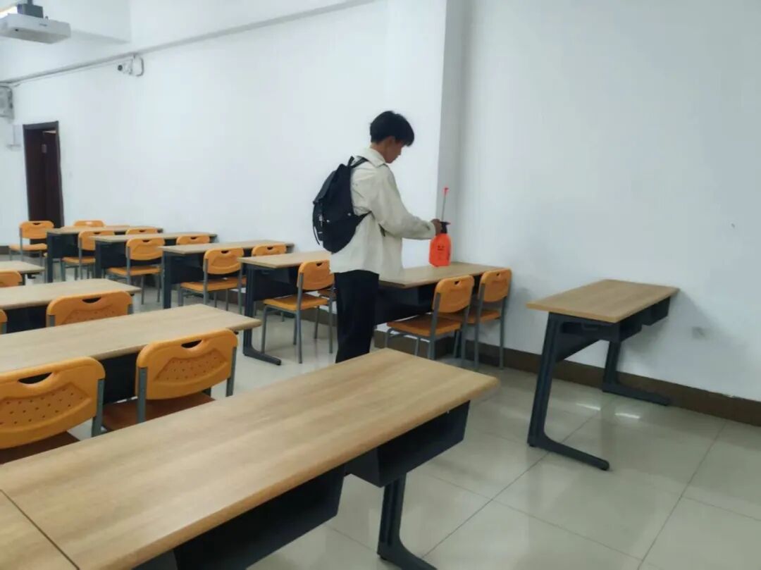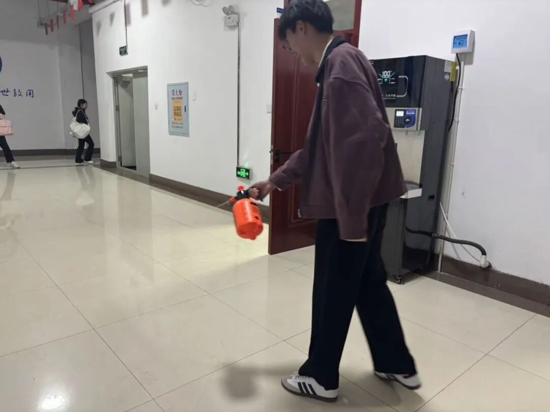活动开始,志愿者们认真学习消杀知识,熟悉操作规范及注意事项,为活动顺利开展奠定坚实基础。我院青年志愿者在第二教学楼内以小组为单位对各楼层教室进行消杀。各小组配置完消毒水后仔细在教室、走廊、安全通道以及各卫生死角、垃圾桶周边喷洒消毒水,不放过任何一个缝隙,确保彻底消除病菌滋生的可能。志愿者认真对门窗、座椅进行多次喷洒和擦拭消毒。在消杀过程中同学们紧密协作、积极配合,形成强大工作合力,现场秩序井然,各项工作高效推进,致力于为大家营造一个安全、卫生的休息环境。