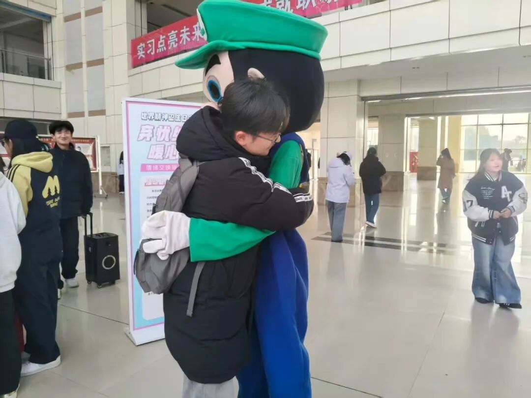 与“情绪交换铺”相邻的“爱的抱抱区”,一只1.8米高的玩偶成为全场焦点,旁边“如果累了,这里有一个不问理由的拥抱”的标语,瞬间拉近了彼此的距离。我院的志愿者主动化身“拥抱传递者”,穿着可爱玩偶服张开双臂,用真诚的身体接触传递无声力量。志愿者不仅主动迎接驻足的同学,还会在拥抱时轻拍后背,用细微的动作传递安慰,让不少因学业、社交而感到疲惫的学子,在这一刻收获了久违的温暖。