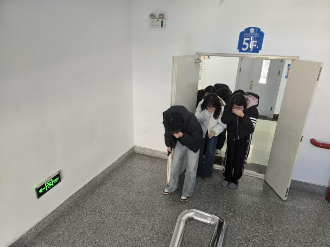 演练以“实验电器短路操作不当引发火情”为模拟场景,全程聚焦实战化应急流程。演练启动后,实验室内师生第一时间发现火情,迅速按下紧急报警按钮,同时拿起就近的灭火器对初期火灾展开扑救。但因模拟火势快速蔓延,仅靠初期处置难以控制,参演师生迅速反应,用湿毛巾捂住口鼻,低姿弯腰,沿指定安全通道有序撤离至第二实验楼空地,以实验室为单位清点人数。整个演练过程组织严密、响应迅速,切实提升了师生在紧急情况下的避险与自救能力。