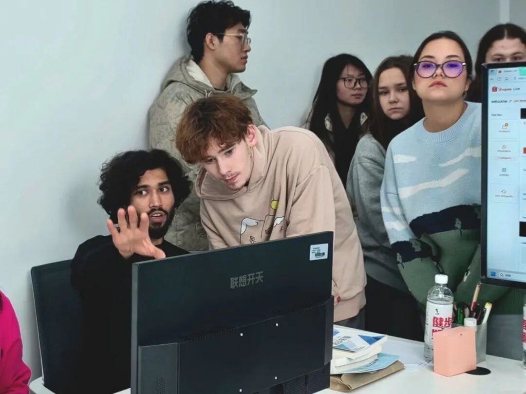 在张楚柠老师的带领下,国际学生走进运营中心开启实操学习。2022级跨境电子商务专业学生李欣雨以Ozon平台为实践载体,细致讲解店铺注册、商品上架、Listing优化、订单处理及跨境物流配送等核心运营环节。她现场演示平台操作流程,针对国际学生关注的多语言翻译、跨境支付结算等实际问题逐一答疑,互动交流中,不少学生边听边记、主动发问,课堂氛围热烈活跃。在掌握关键运营技巧时,国际学生纷纷展露了然笑容,切实体会到跨境电商操作的实用性与趣味性