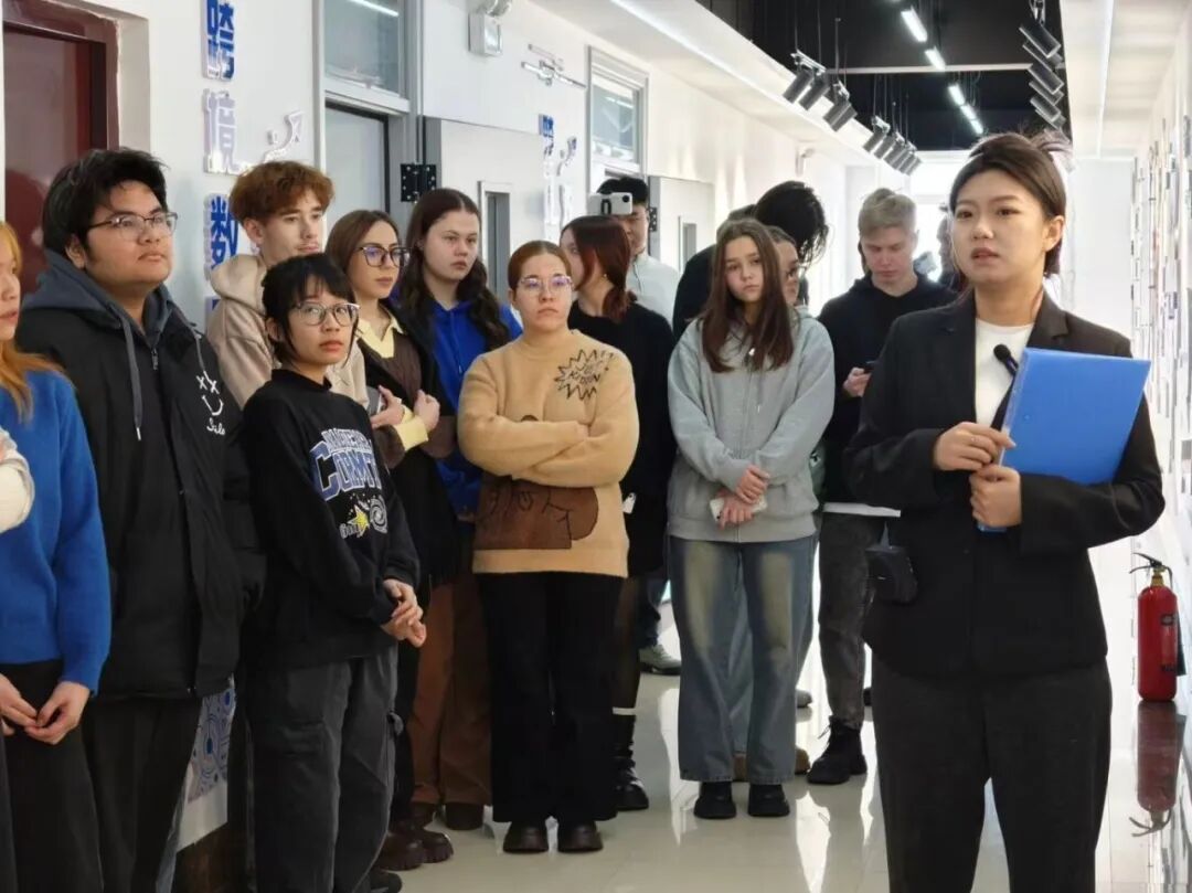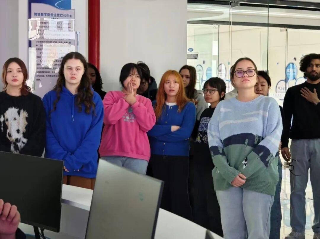 随后,国际学生先后探访政校企工作站与直播中心,实地感受跨境电商产业实战氛围。在政校企工作站,学生们直观了解校企合作资源整合模式与跨境电商项目落地全流程,清晰见证课堂理论在产业实践中的转化应用;在直播中心,标准化的直播设备、专业的场景布置引发大家浓厚兴趣,围绕跨境直播选品策略、多语言话术设计等话题展开热烈探讨,进一步拓宽了对跨境电商多元化运营模式的认知边界。