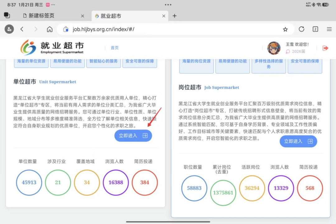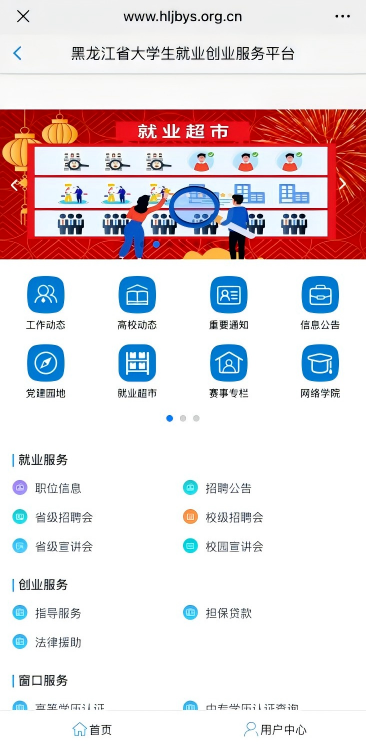 或进入黑龙江省大学生就业创业服务平台 (https://www.hljbys.org.cn/)点击“就业超市”进入。