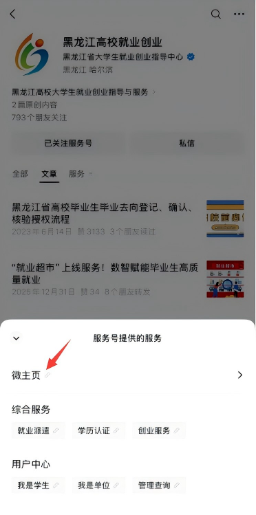 (二)手机端操作 毕业生搜索“黑龙江高校就业创业”微信公众号,点击“服务”-“微主页”,点击“就业超市”进入。后续操作参考PC端操作流程。