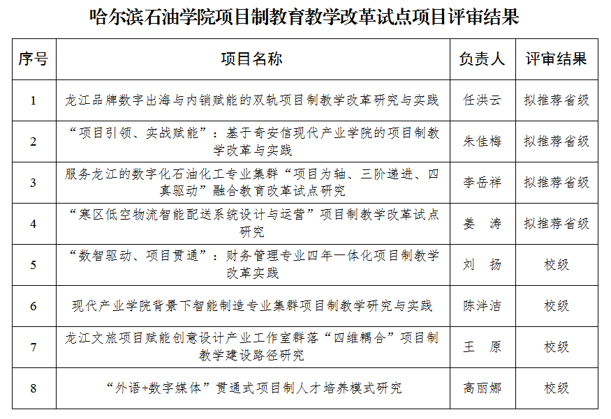 根据黑龙江省教育厅《关于组织开展全省本科高校项目制教学改革试点工作的通知》,学校组织开展了相关工作。经个人申报,教学部门推荐,学校专家组评审,拟同意以下8个项目为校级项目制教育教学改革试点培育项目,其中4个项目拟推荐参与省级项目制教育教学改革试点项目评审。现予以公示。