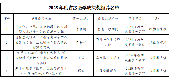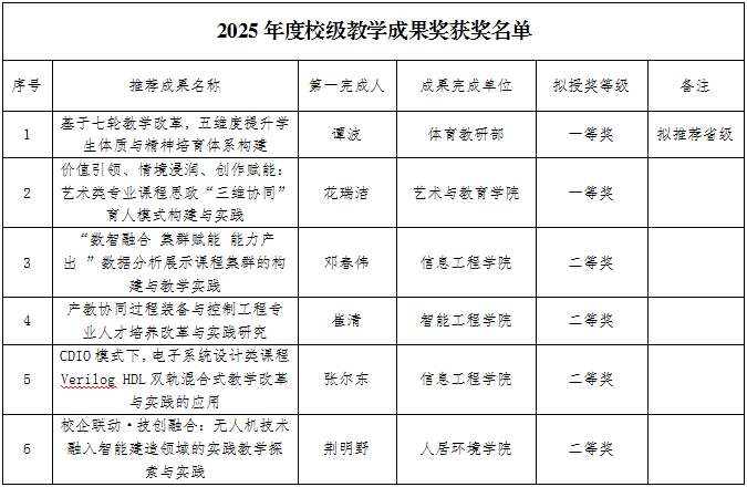 根据《关于开展2025年黑龙江省高等教育教学成果奖评审工作的通知》《关于开展2025年校级教学成果奖评审暨省级教学成果奖推荐工作的通知》,学校组织和开展了相关工作。经个人申报,教学部门推荐,学校专家组评审,评选出2025年校级教学成果一等奖2项,二等奖4项,拟推荐《“双体、三境、四维融通”的应用型人才培养体系的改革与实践》等4项成果参与2025年省教学成果奖的评选,现将结果予以公示。