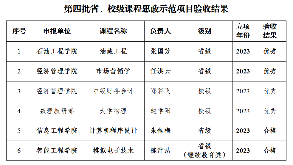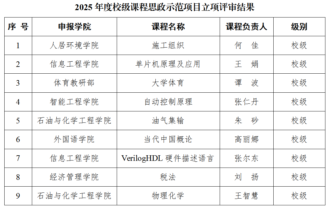 根据教学工作安排,学校组织开展了2025年度校级课程思政示范课程和教学团队培育项目(以下简称“课程思政示范项目”)遴选及第四批省、校级课程思政示范项目验收评审。经个人申报、各院(部)初审、教务处复审,学校专家组评审,评选出以下9项为2025年度校级课程思政示范项目;6项第四批省、校级课程思政示范项目通过验收。现将结果予以公示。