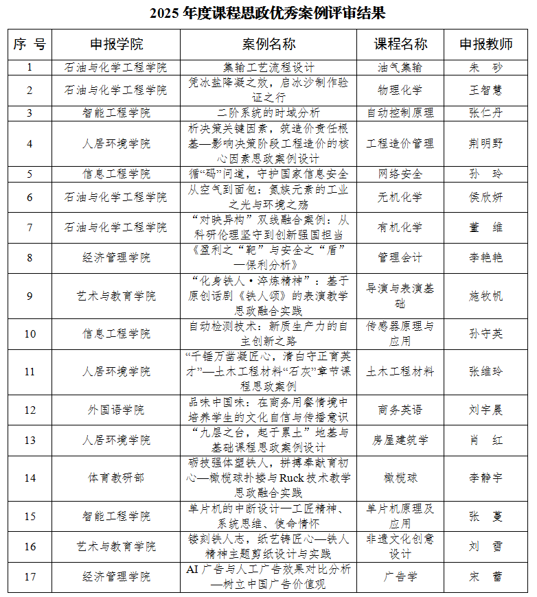 根据教学工作安排,学校组织开展了2025年度课程思政优秀教学案例评审工作。经个人申报、各院(部)推荐、学校专家组评审,评选出以下17项为2025年度课程思政优秀教学案例。现将结果予以公示。