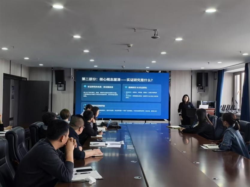 培训伊始,孟老师围绕“为什么要做实证研究”展开系统阐述。她指出,实证研究强调研究的可验证性与科学性,是确保学术成果严谨性的重要基石,也是推动教学研究从“经验型”走向“科学型”的关键路径。通过数据与证据支撑研究结论,能够更精准地回应教学实践中的真实问题,提升研究成果的实践价值与推广意义。