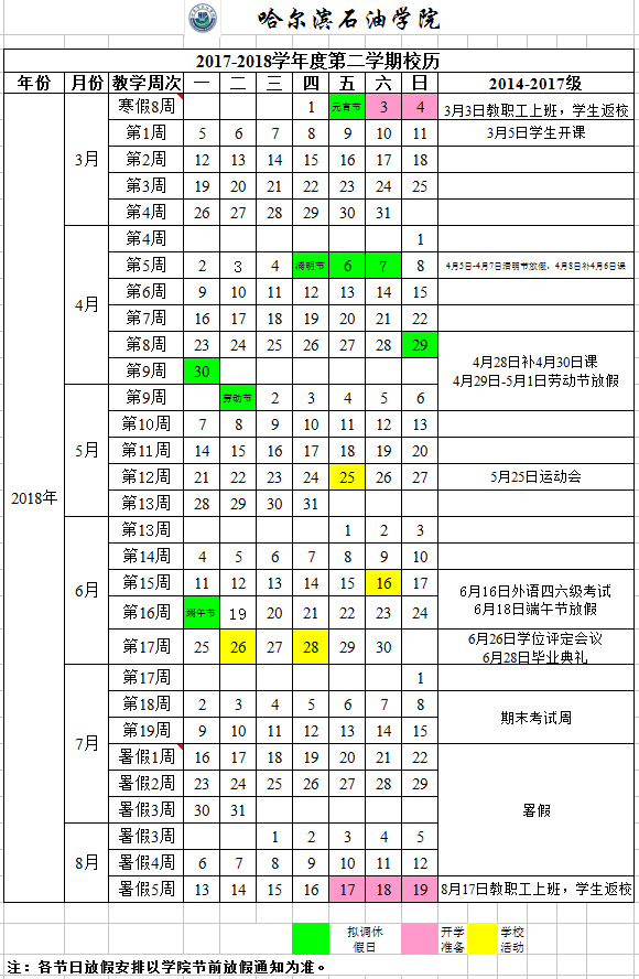 哈尔滨石油学院2017-2018学年度第一学期校历