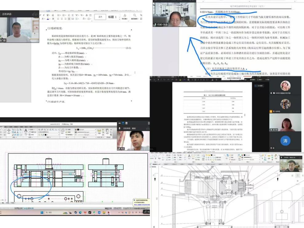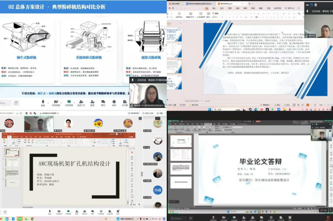 云端答辩现场秩序井然,各小组流程规范、推进有序。学生们凭借精心制作的PPT,依次向评审专家汇报研究成果与设计思路,围绕选题背景、研究方法、关键零部件计算、图纸绘制等核心内容详细阐述,充分展现了扎实的专业储备与工程设计素养。